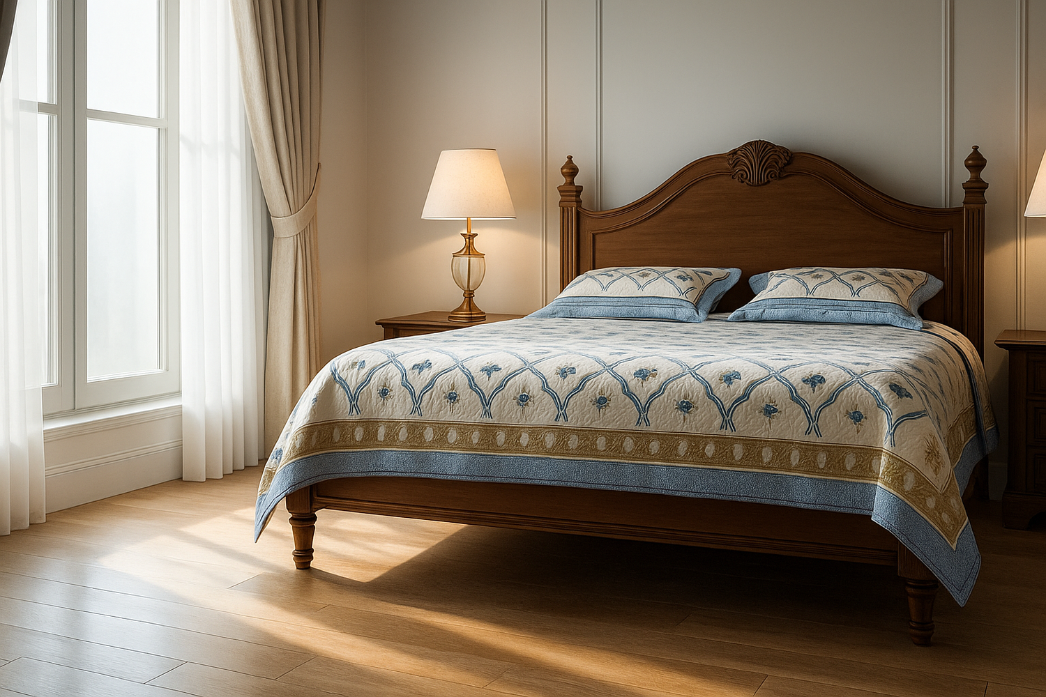 Blue Floral Mulmul Quilted Bedcover 4-Piece Set