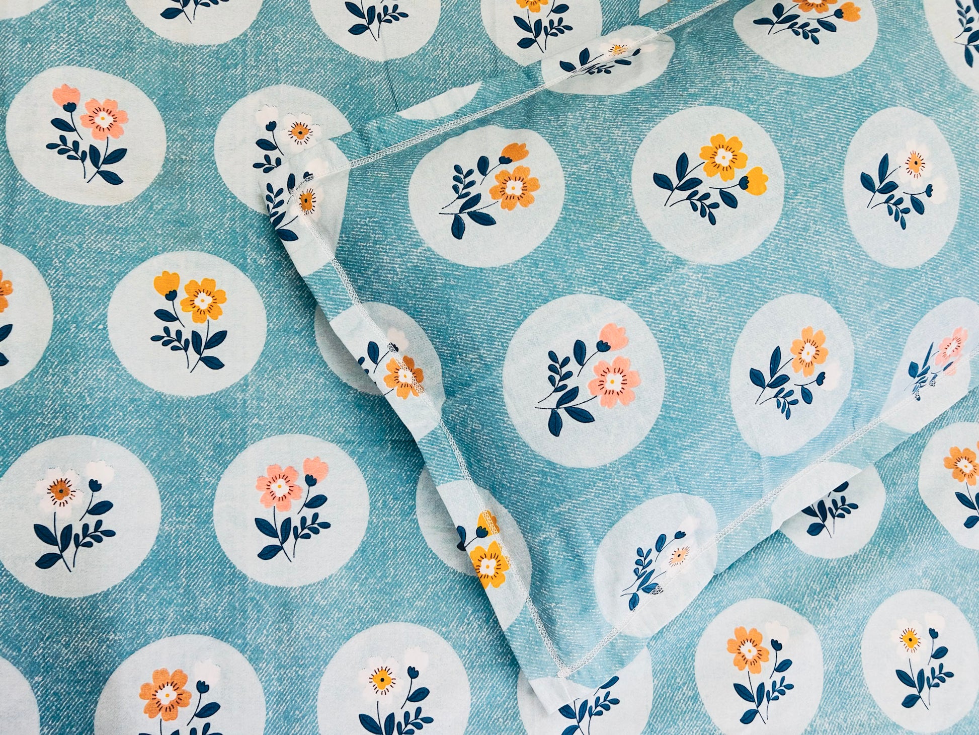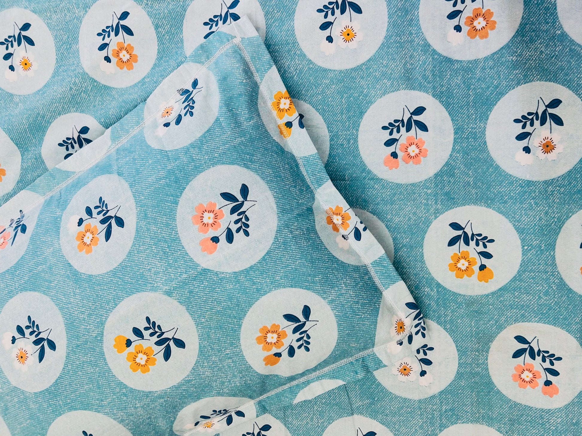 Add a cheerful touch to your bedroom with our Aqua Blossom Bedsheet Set, crafted from superfine 350 TC pure cotton for a luxuriously soft and breathable feel. The soothing aqua blue backdrop with delicate floral motifs in warm tones of peach, mustard, and navy creates a refreshing and joyful look. perfect for brightening up your space with effortless elegance.
