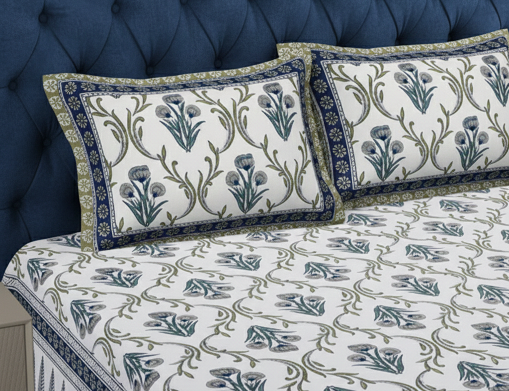 Celebrate timeless craftsmanship with our Jaipuri Sanganeri print bedsheet, crafted from 100% pure cotton with a 200 TC weave. Soft, breathable, and skin-friendly, this bedsheet brings everyday comfort with a touch of heritage. The classic blue floral motif with a coordinated border adds effortless elegance to both traditional and modern bedrooms. Machine wash recommended for easy care.