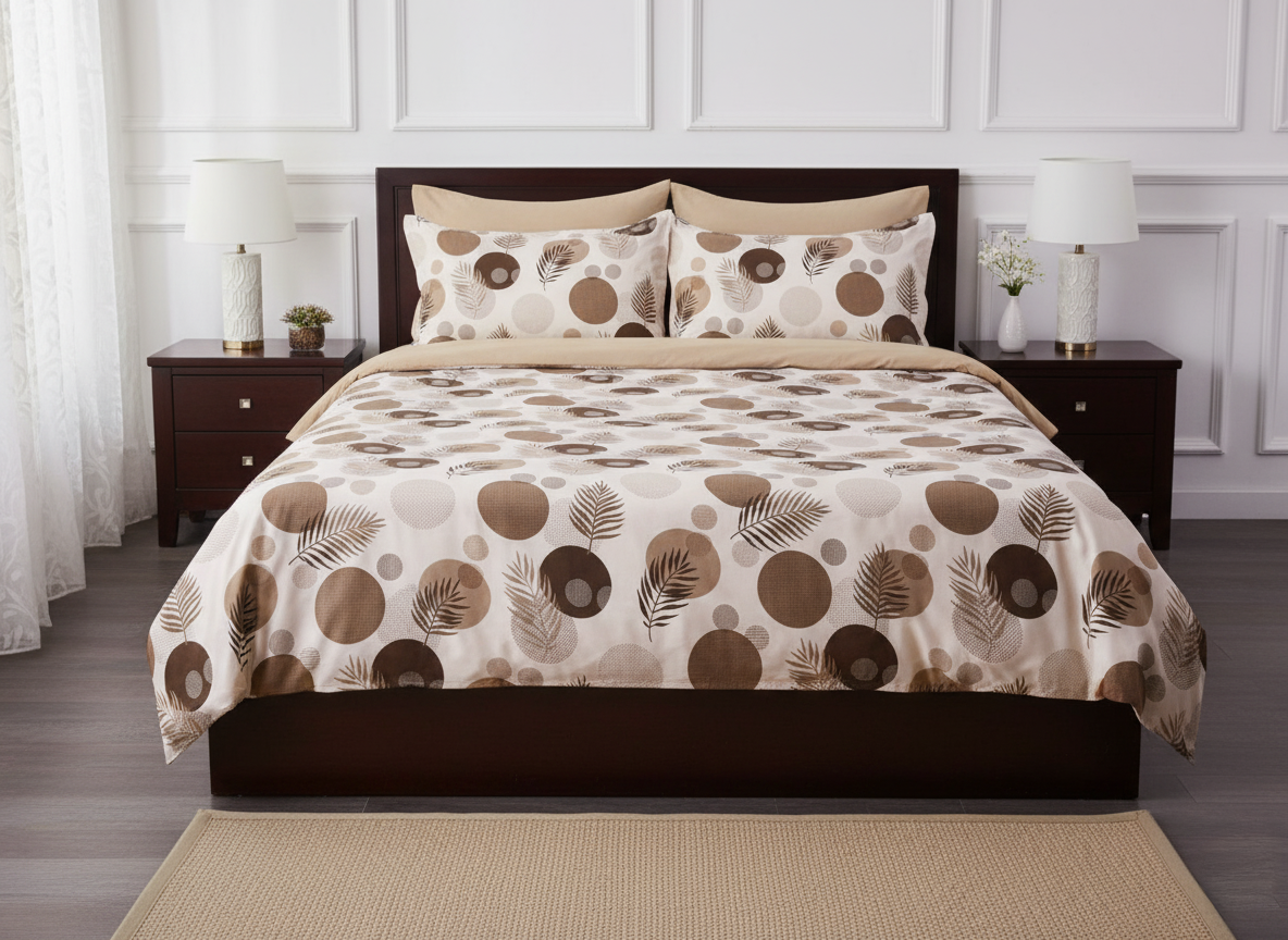 This bedsheet set is perfect for giving your room a natural, relaxed feel. It features a simple pattern of leaves and small circles in calm, cozy brown and beige colors. It’s an easy way to bring a touch of the outdoors inside.