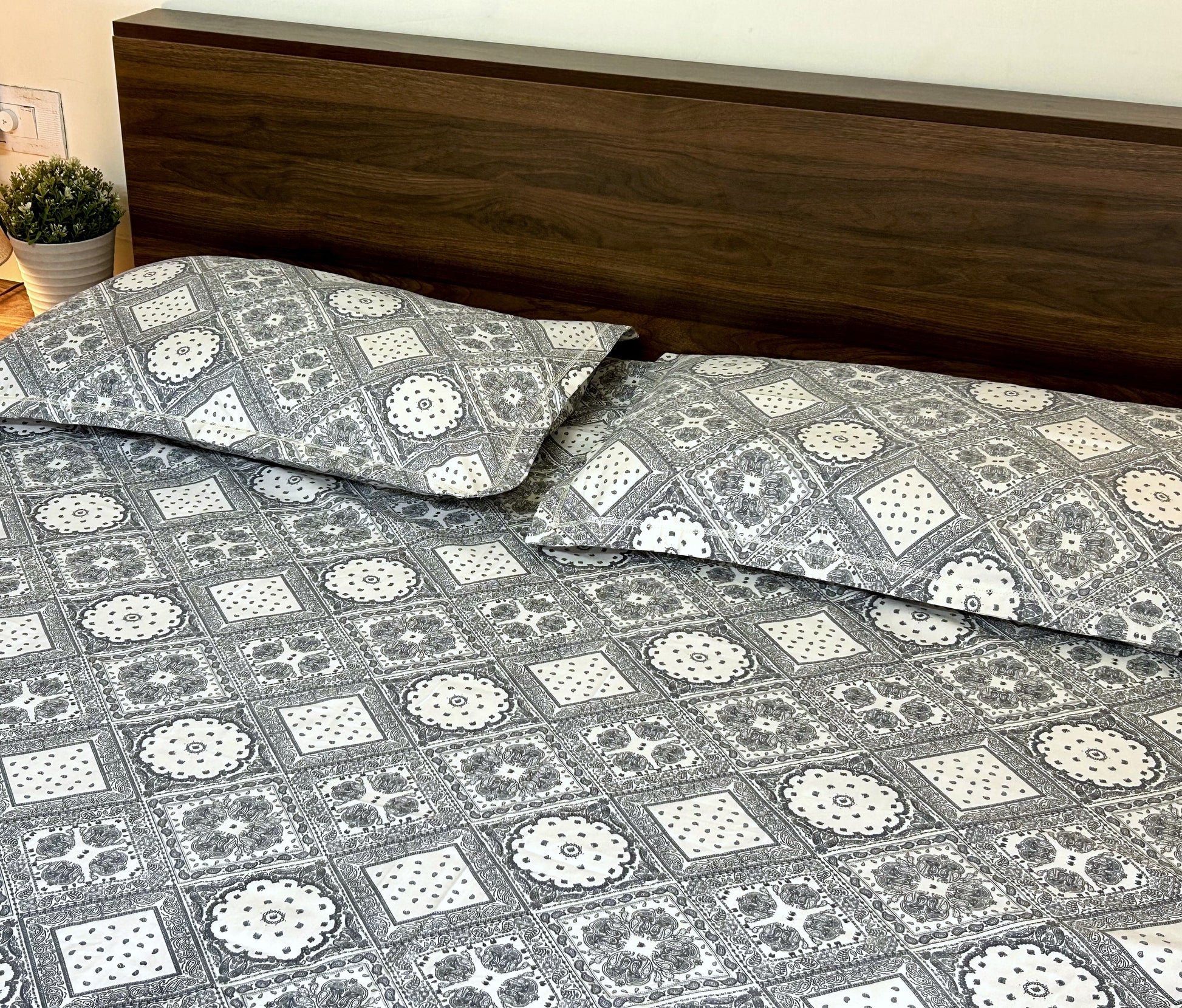 Elevate your space with timeless charm through our Grey Mosaic Bedsheet Set, crafted from premium 350 TC pure cotton for an irresistibly smooth and breathable feel. The intricate geometric pattern in soft grey and white tones adds a modern yet classic appeal, blending effortlessly with any bedroom décor. Perfect for those who appreciate understated elegance and everyday comfort.