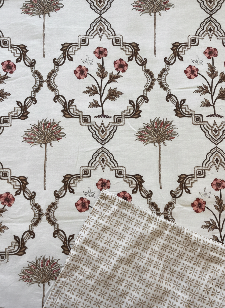 Each Dohar is a unique piece of traditional textile art, featuring authentic Hand Block Print. The elegant design showcases intricate floral and tree motifs framed by sophisticated ornate patterns. The chic palette features motifs in soft crimson/red and warm brown/mauve on a light cream base. The look is completed by an intricate, fine border detail and a complementary reversible pattern.