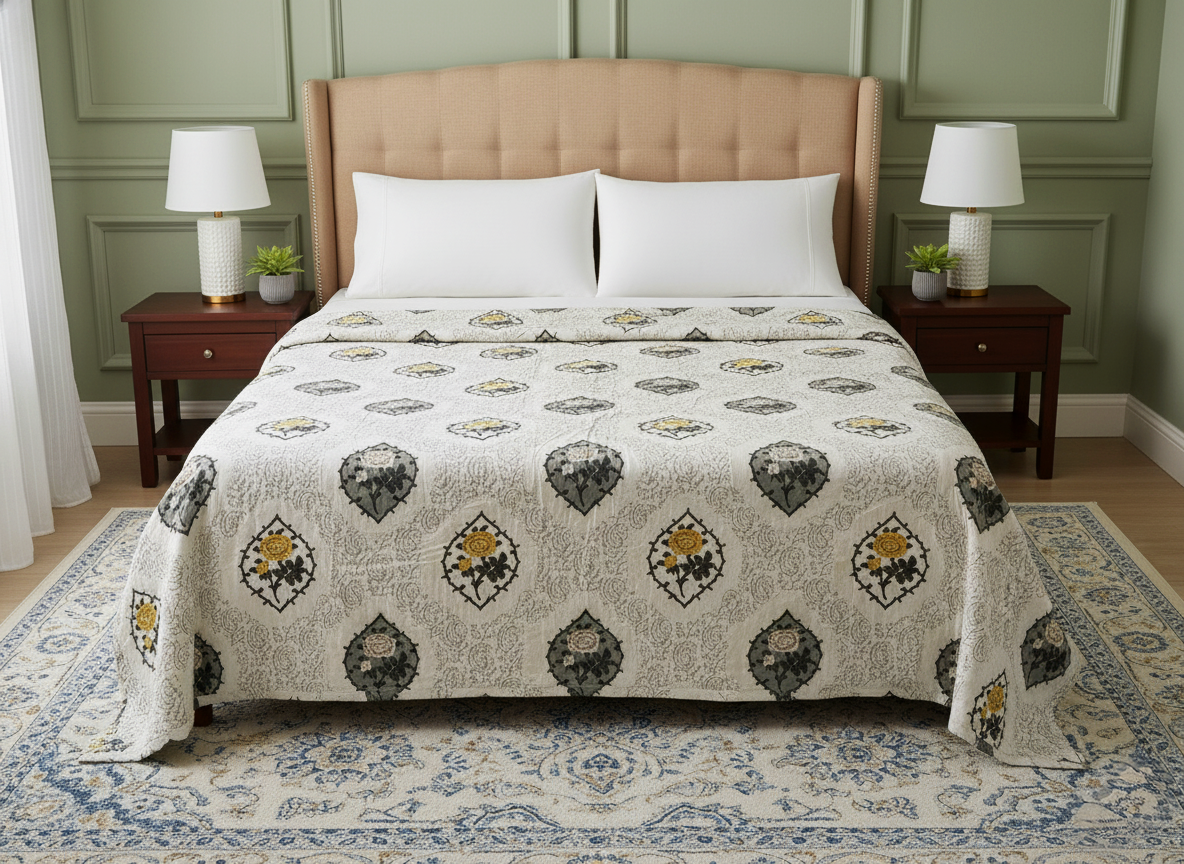 Mustard Yellow & Grey Roses | Jaipuri Double Mulmul Dohar Comforter