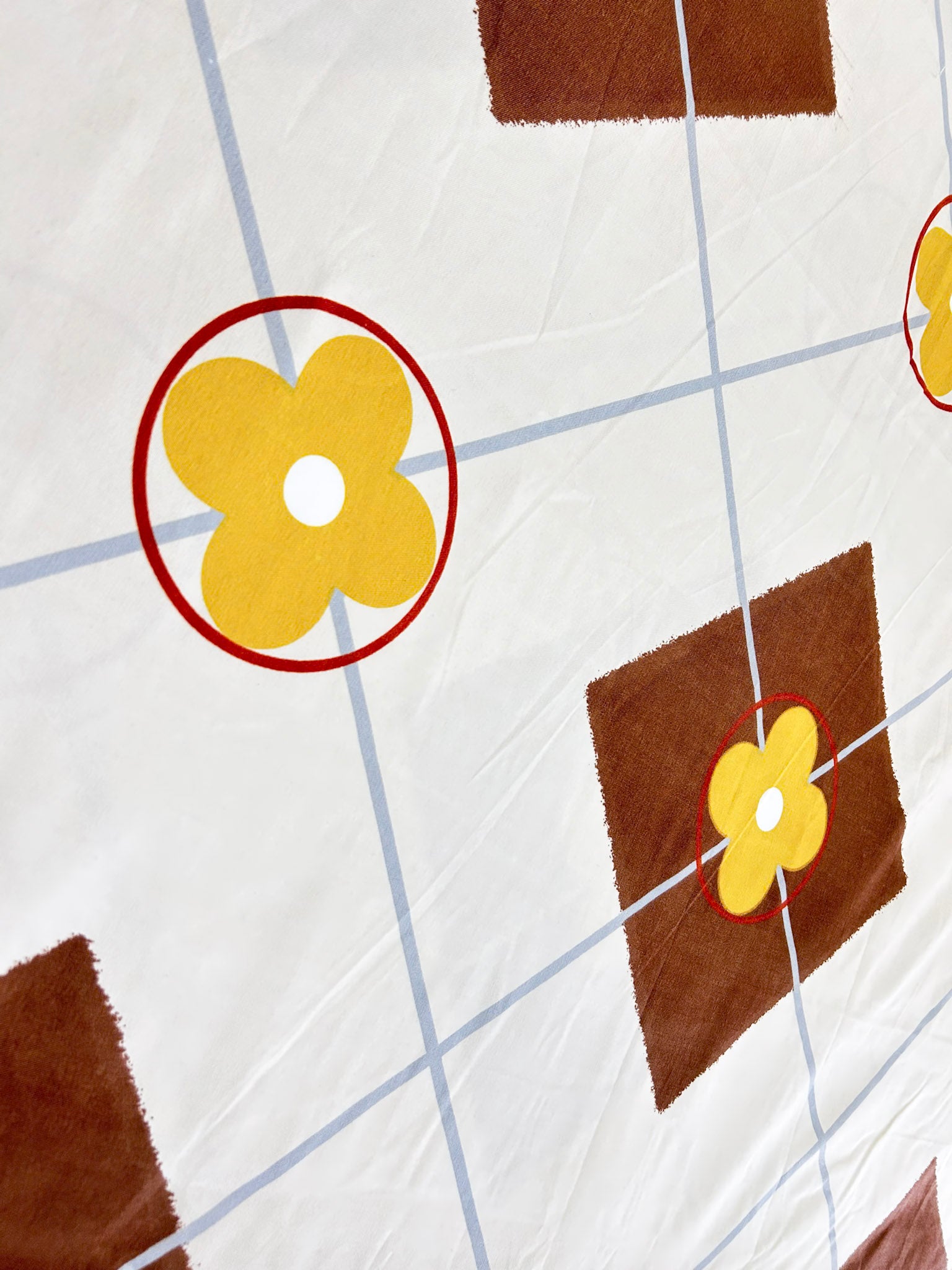 Brighten your space with the modern charm of our Sunburst Geometry Bedsheet Set. Crafted from superfine 350 TC pure cotton, this bedsheet combines softness, durability, and breathable comfort. The bold geometric pattern in shades of mustard yellow and warm brown on an ivory base creates a refreshing yet balanced aesthetic.