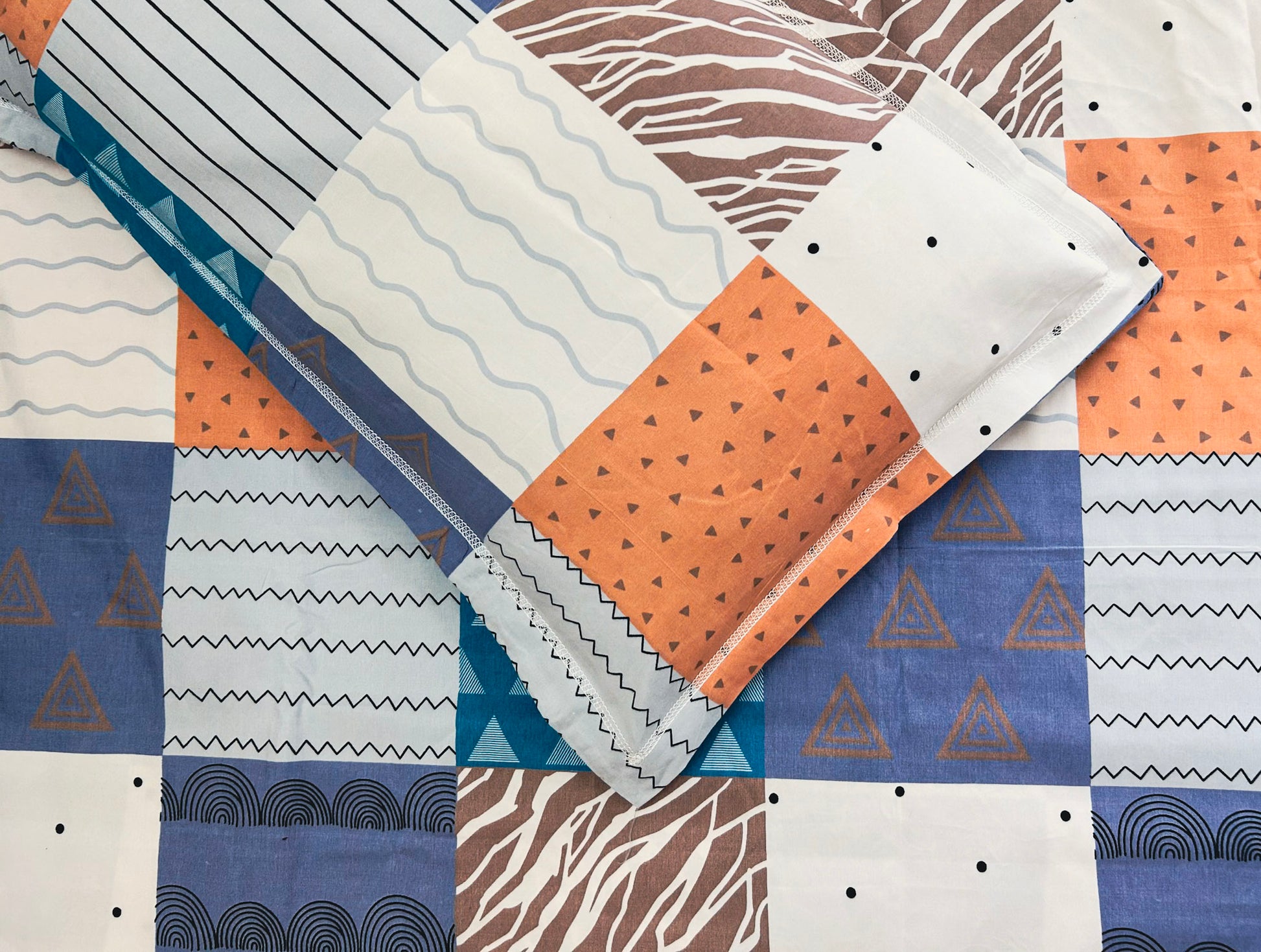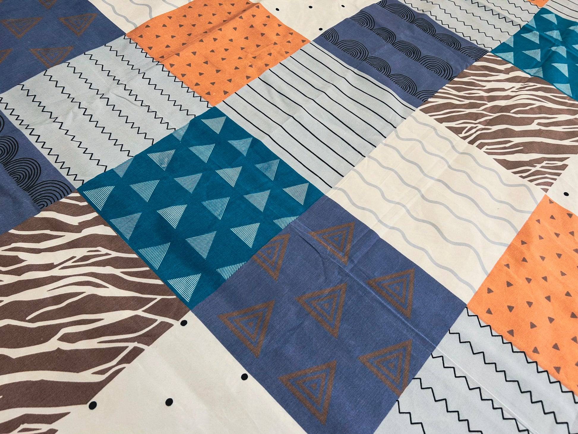 - Color Palette: Blue, rust, white, and brown in geometric patchwork pattern