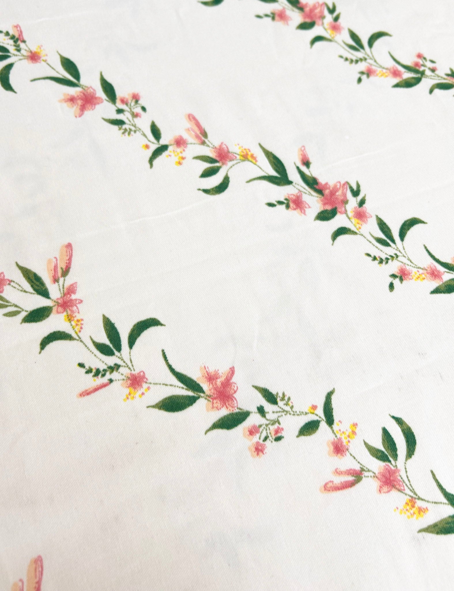- Color Palette: Soft White base with Pink and Green floral motifs